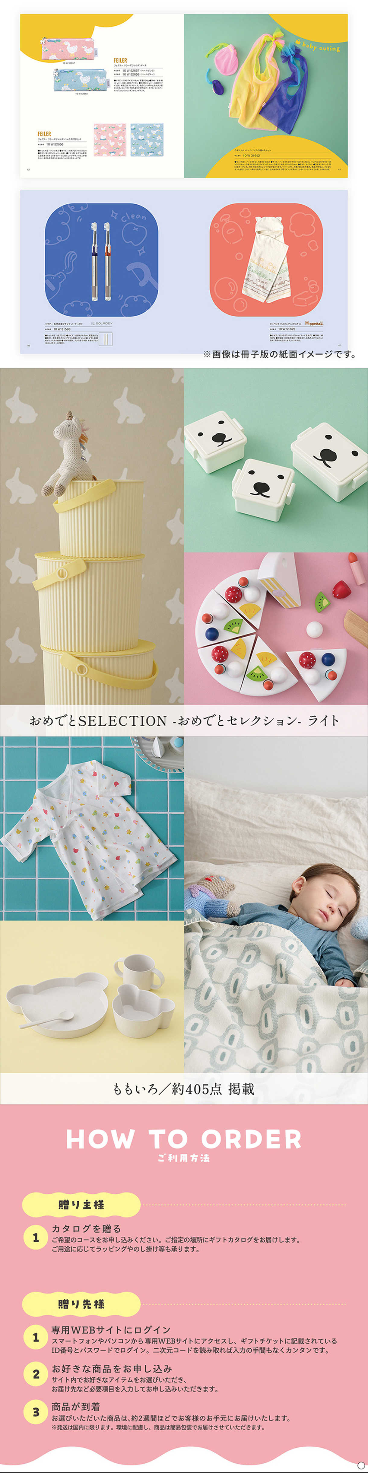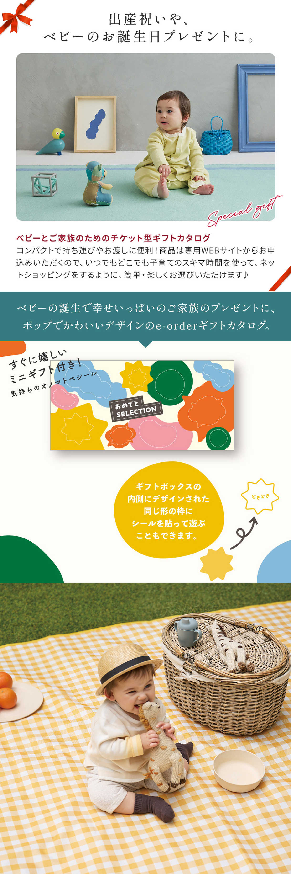 『おめでとセレクション』は、出産祝いやベビーのお誕生日プレゼントにぴったり。知育遊びを促すオリジナルのおもちゃ付きで「貰った瞬間から嬉しい」ギフトカタログです。オノマトペがモチーフのポップでかわいいデザインと、「ベビーを迎えたばかりのママとパパが本当にほしいもの」「子どもが笑顔になるもの」を集めた商品ラインナップも魅力的な、ベビーギフトの新定番です。