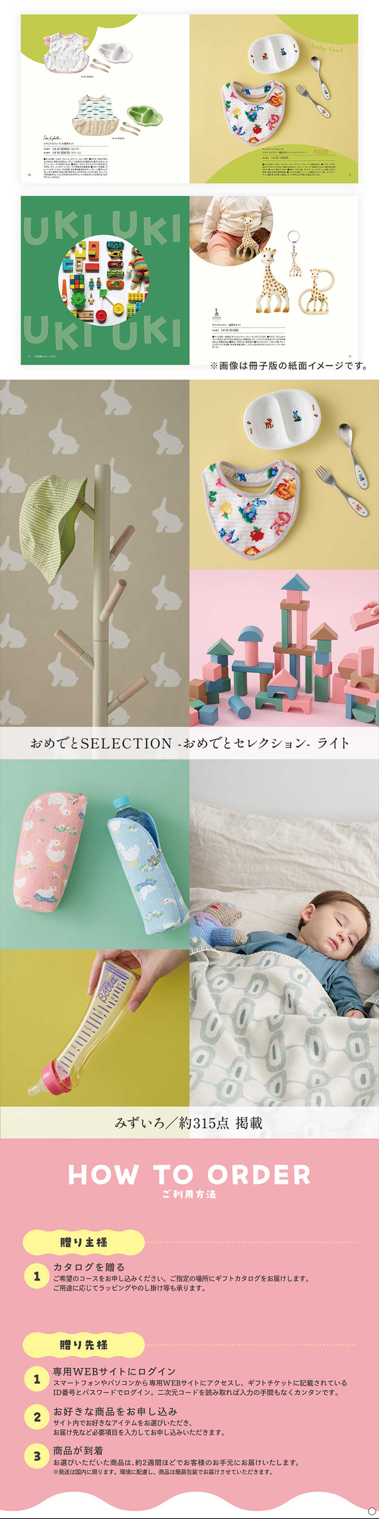 ギフトをお渡しした瞬間も、商品をお選びいただいてからも、何度も喜んでいただけるギフトカタログとオリジナルおもちゃのセットです。