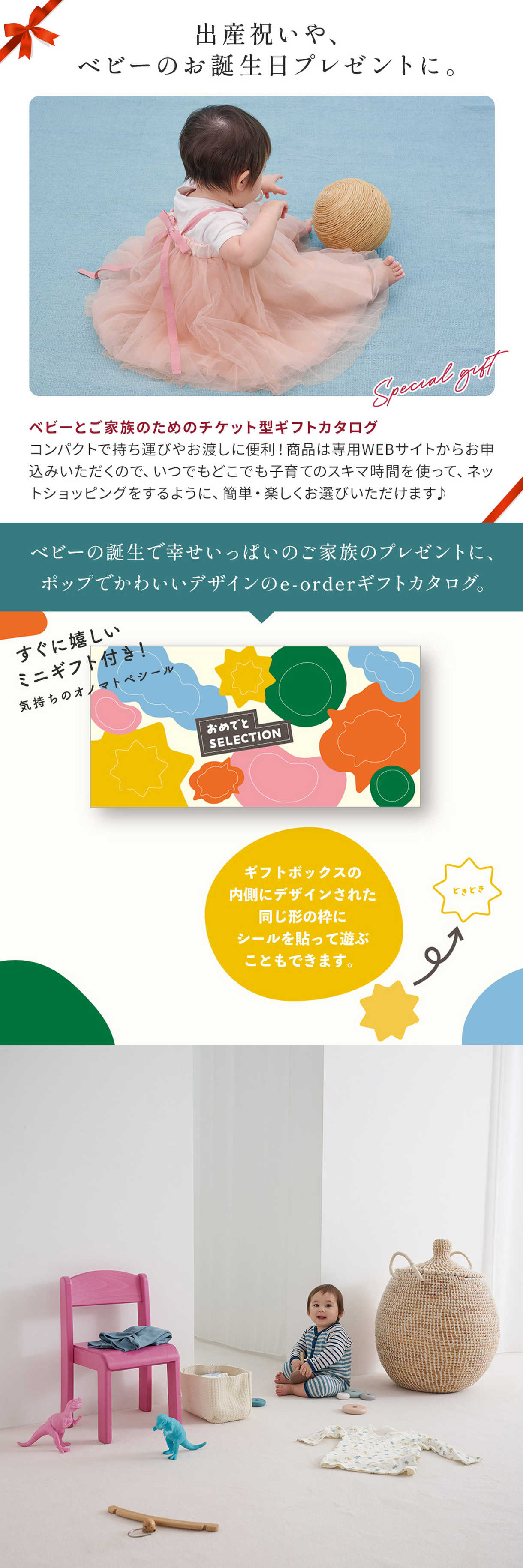 『おめでとセレクション』は、出産祝いやベビーのお誕生日プレゼントにぴったり。知育遊びを促すオリジナルのおもちゃ付きで「貰った瞬間から嬉しい」ギフトカタログです。オノマトペがモチーフのポップでかわいいデザインと、「ベビーを迎えたばかりのママとパパが本当にほしいもの」「子どもが笑顔になるもの」を集めた商品ラインナップも魅力的な、ベビーギフトの新定番です。