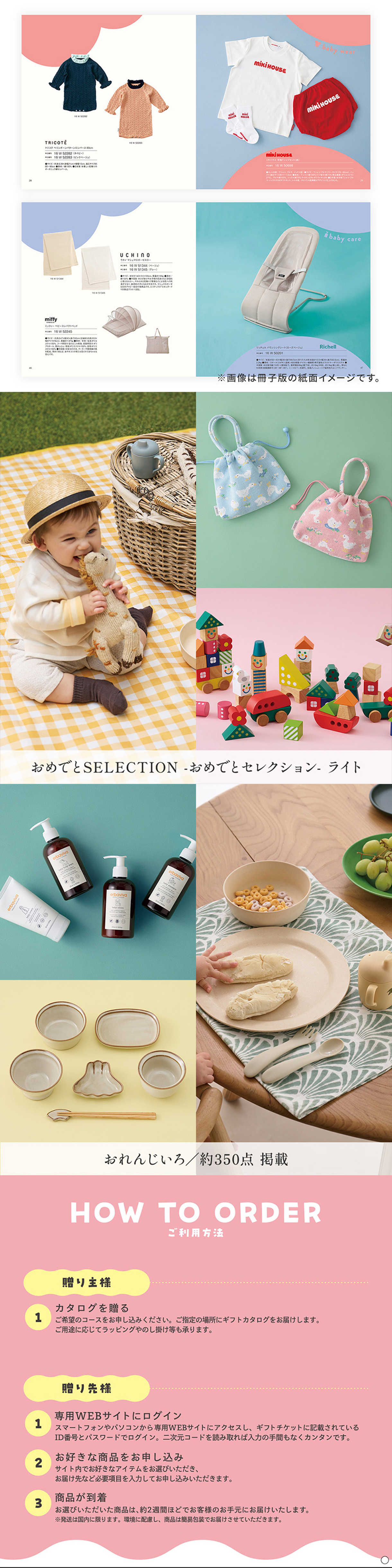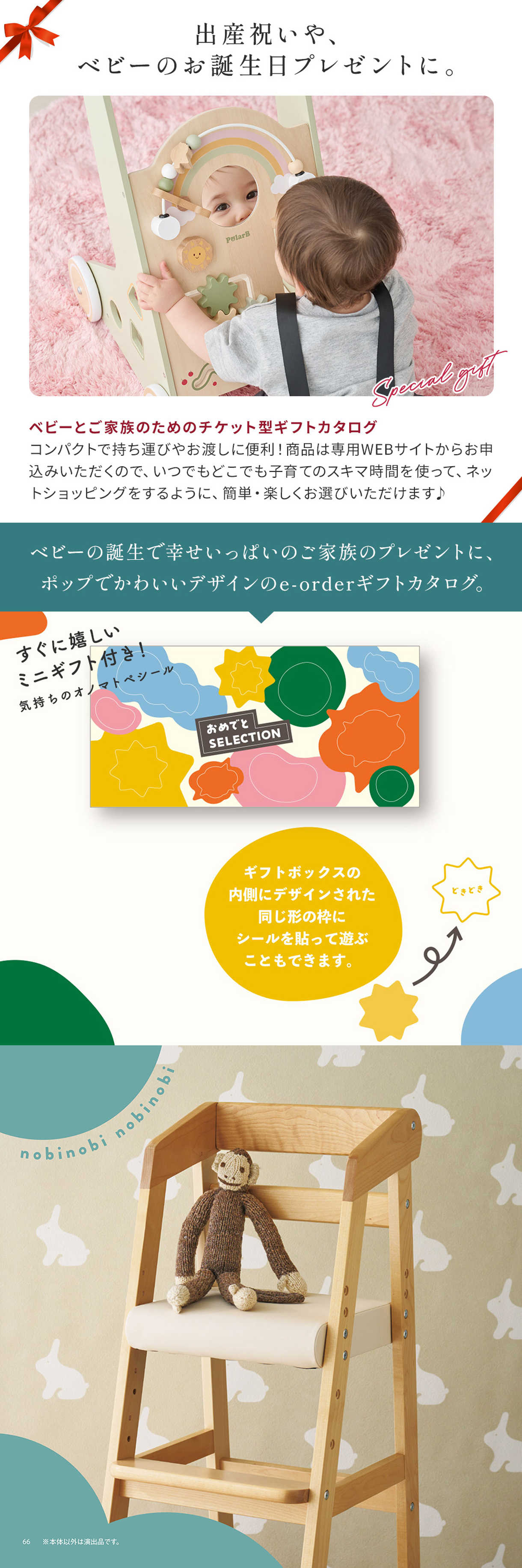 『おめでとセレクション』は、出産祝いやベビーのお誕生日プレゼントにぴったり。知育遊びを促すオリジナルのおもちゃ付きで「貰った瞬間から嬉しい」ギフトカタログです。オノマトペがモチーフのポップでかわいいデザインと、「ベビーを迎えたばかりのママとパパが本当にほしいもの」「子どもが笑顔になるもの」を集めた商品ラインナップも魅力的な、ベビーギフトの新定番です。