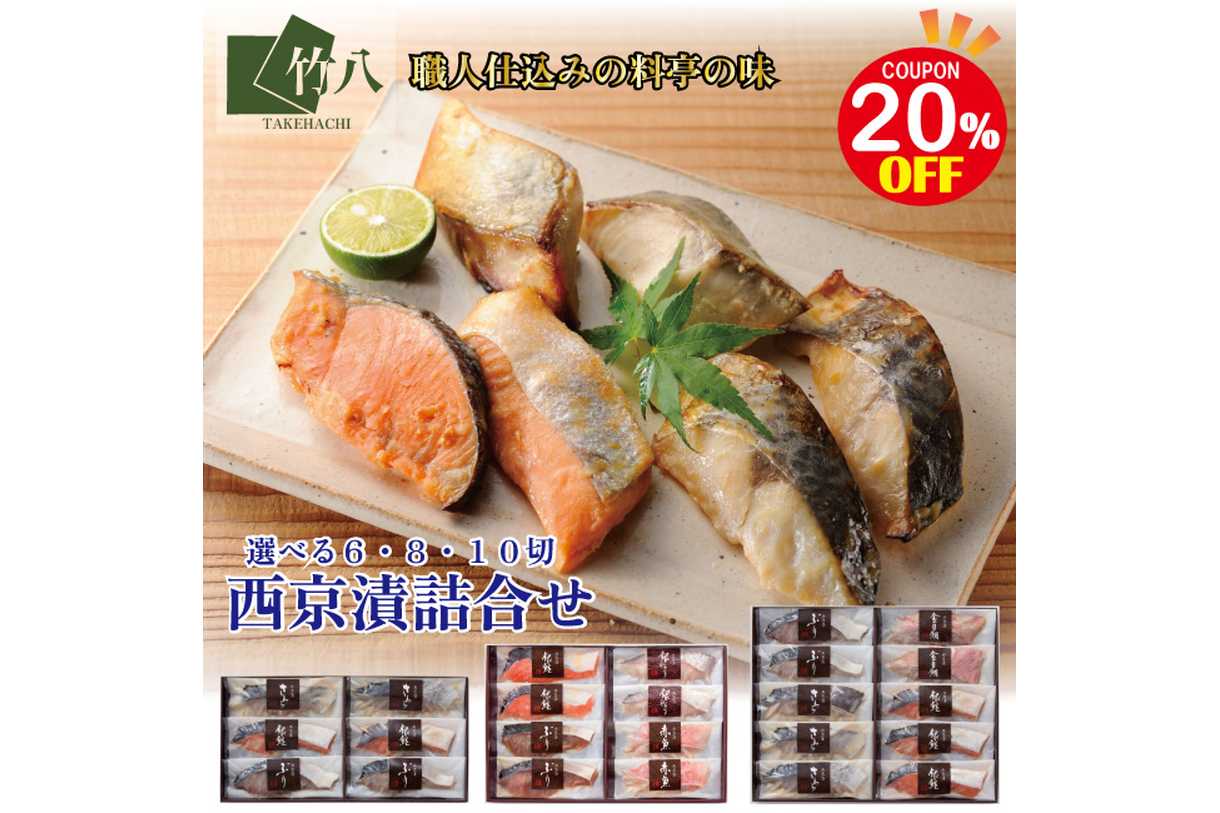 竹八 \西京漬詰合せ 10切 赤魚・銀鮭・銀ひらす・ぶり・金目鯛 化粧箱入り/