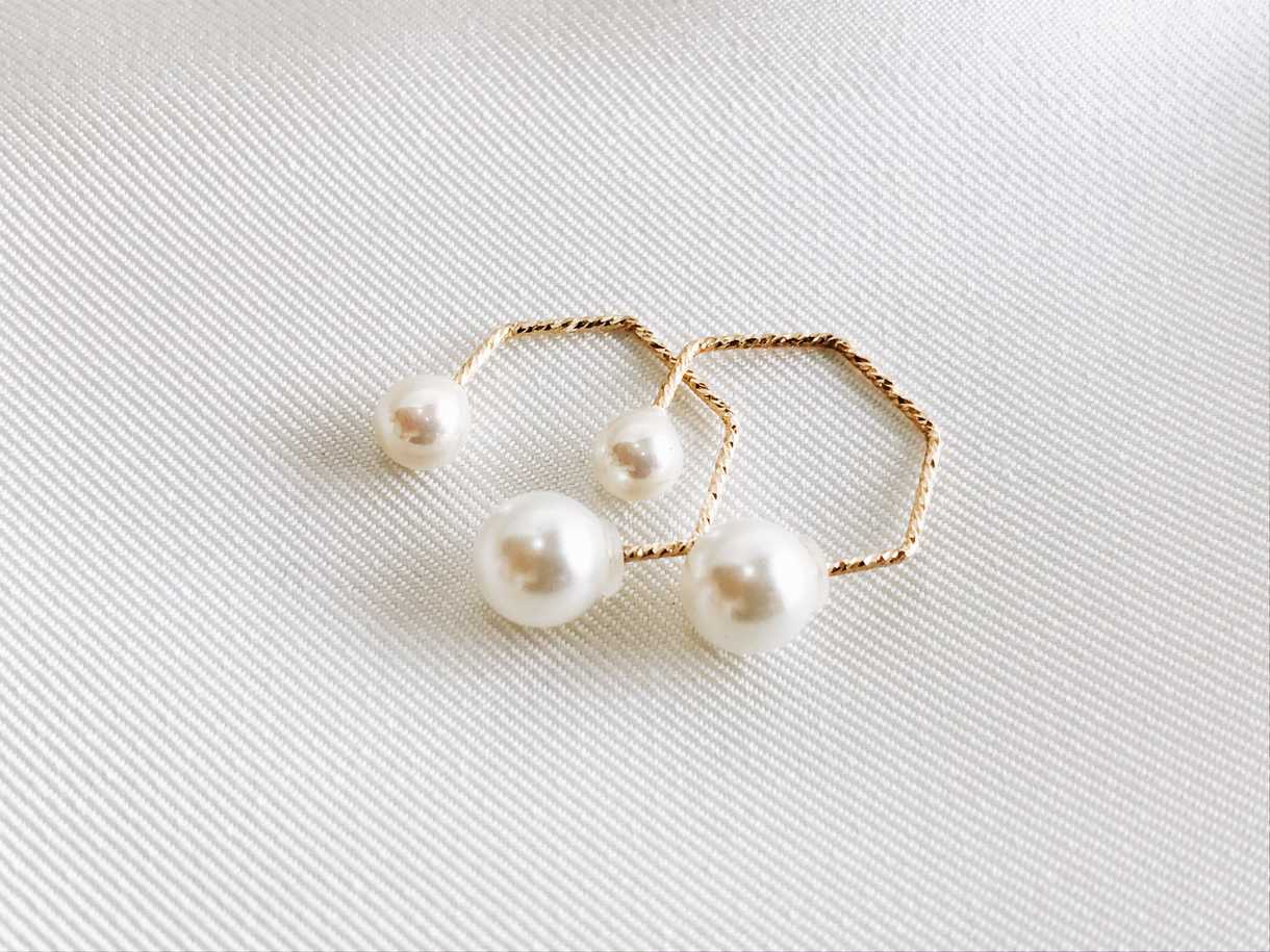 人と差がつくデザイン、六角形の貝パールのピアス。仕事にパーティーにオシャレに決まるアクセサリーです。