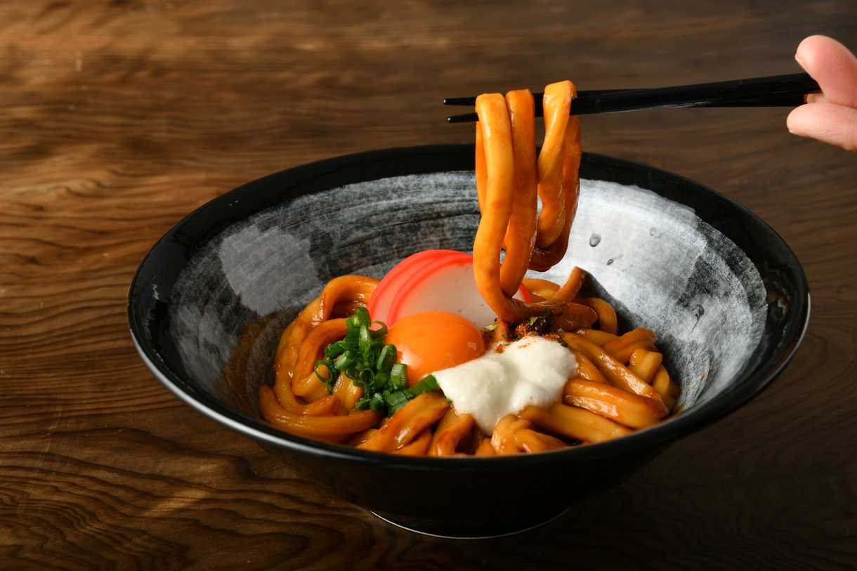 太くて柔らかい麺に甘辛いタレをかけて召し上がる伊勢の名物「伊勢うどん」です。
