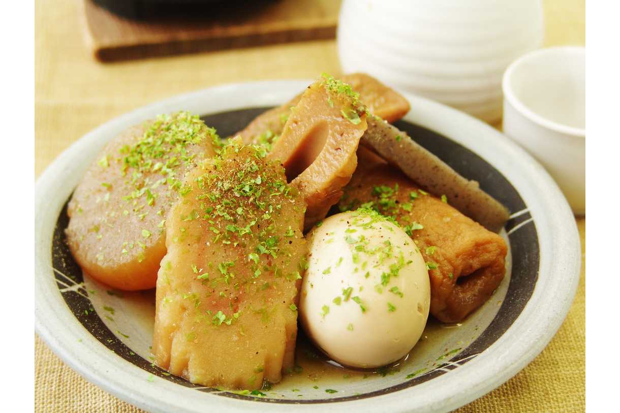 (具材:大根、卵、黒はんぺん、なると巻、ごぼう巻、煮込みちくわ、こんにゃく)