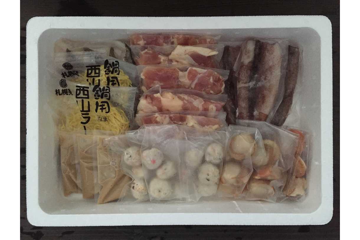 北海道産鶏もも肉100g×5袋 、ツボ抜きいか100g×3尾、ボイル帆立 20g×9個、助宗鱈切身40g×4切、たこ入つみれ15g×12個、冷凍生ラーメン80g×2玉、たれ(濃縮:白湯仕立て)50ml×3袋