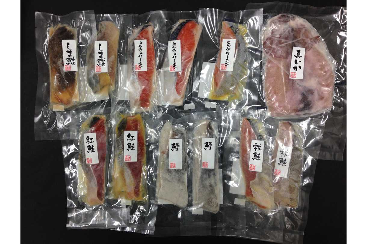 秋鮭甘味噌漬切身80g×2、しまほっけ甘味噌漬切身80g×2、トラウトサーモン粕漬切身80g×2、真鱈粕漬切身80g×2、紅鮭西京漬切身80g×2、キングサーモン西京漬切身80g×1、真いか粕漬け150g×1