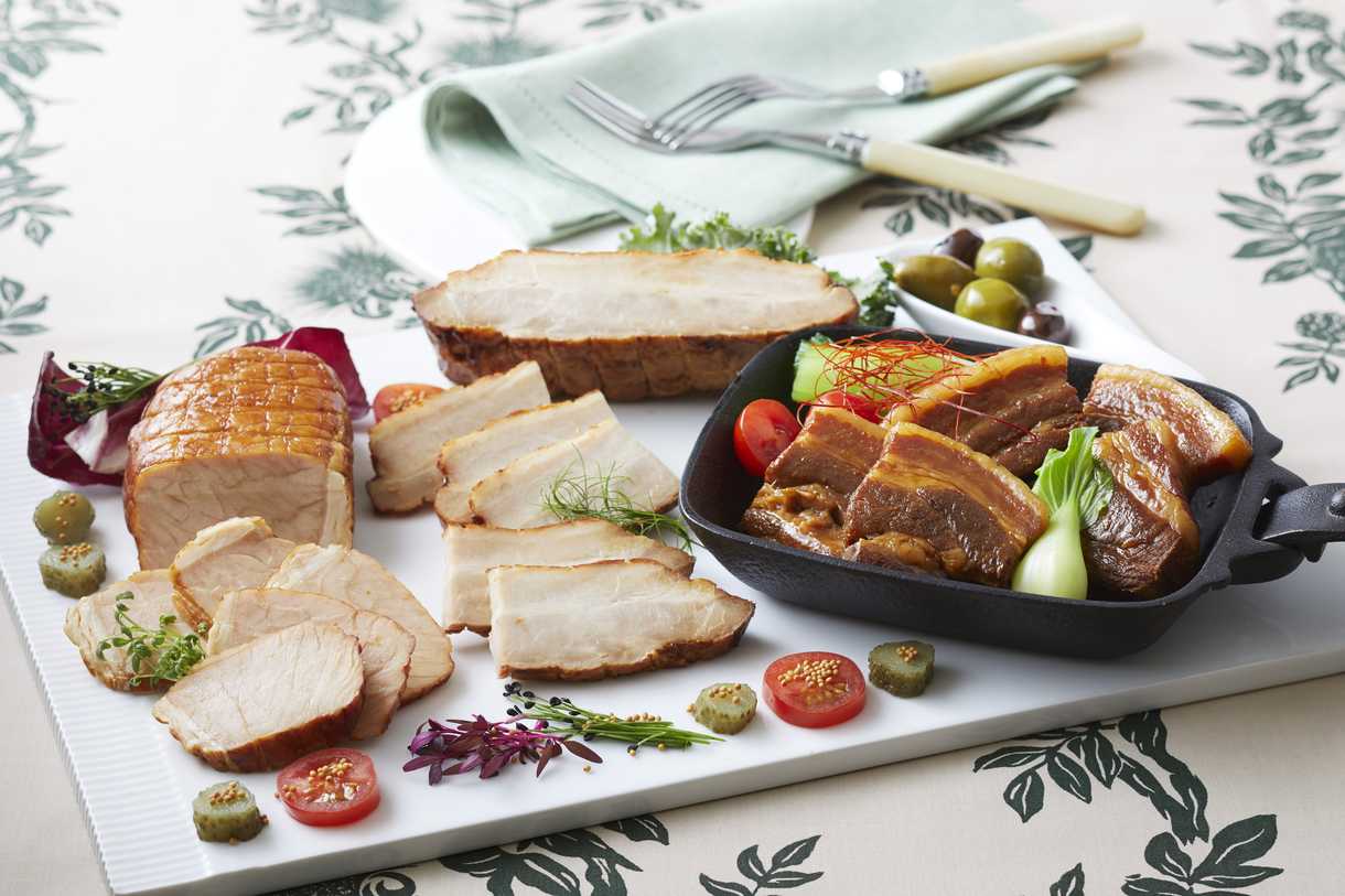 その風土のなか、職人が織りなす巧みな技により作り上げました。一本一本つるし焼きした自慢の焼豚と、独自の加熱製法により、しっかりお肉に味が染み込んだ豚角煮、トンポーロのセットです。